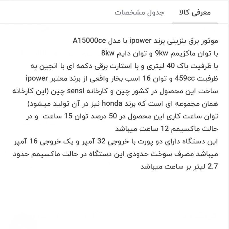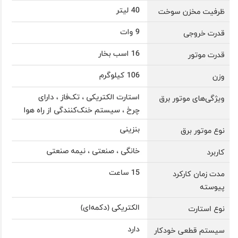 ظرفیت مخزن سوخت 40 لیتری 16 اسب بخار 106 کیلوگرم وزن بنزینی استارت الکتریکی